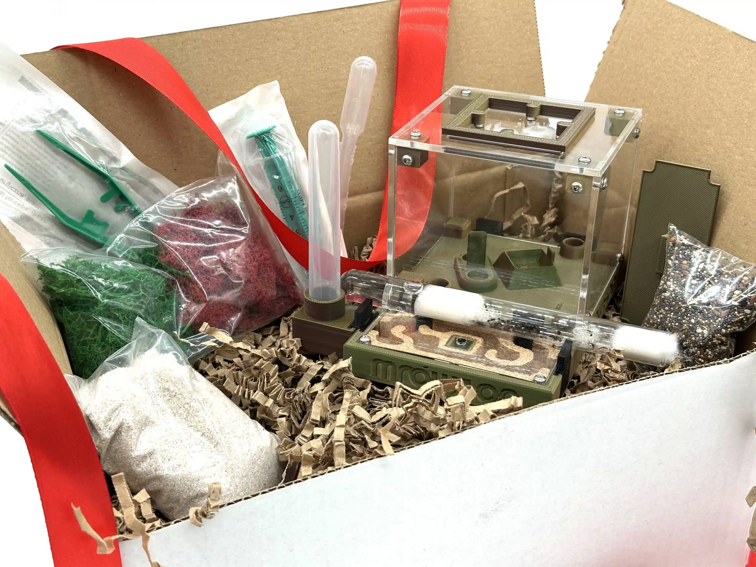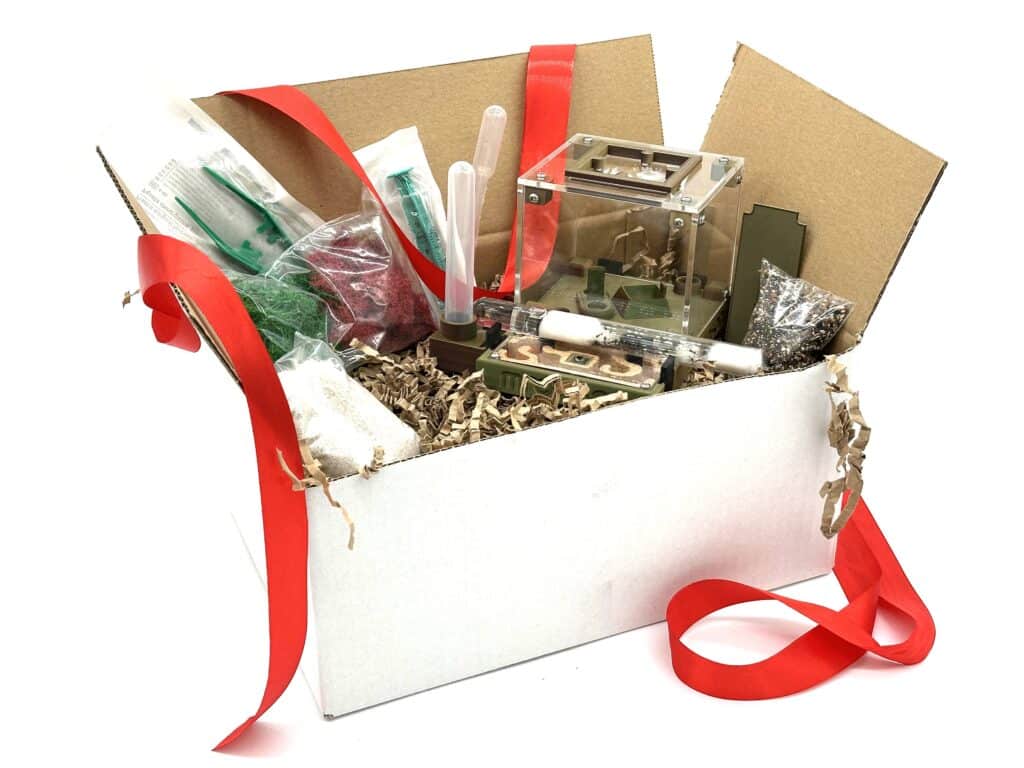 Po rozpakowaniu potrzebujesz tak naprawdę tylko odrobiny czasu, trochę wody i kawałka stabilnego miejsca, aby przygotować pierwsze formikarium. Reszta jest w pudełku.