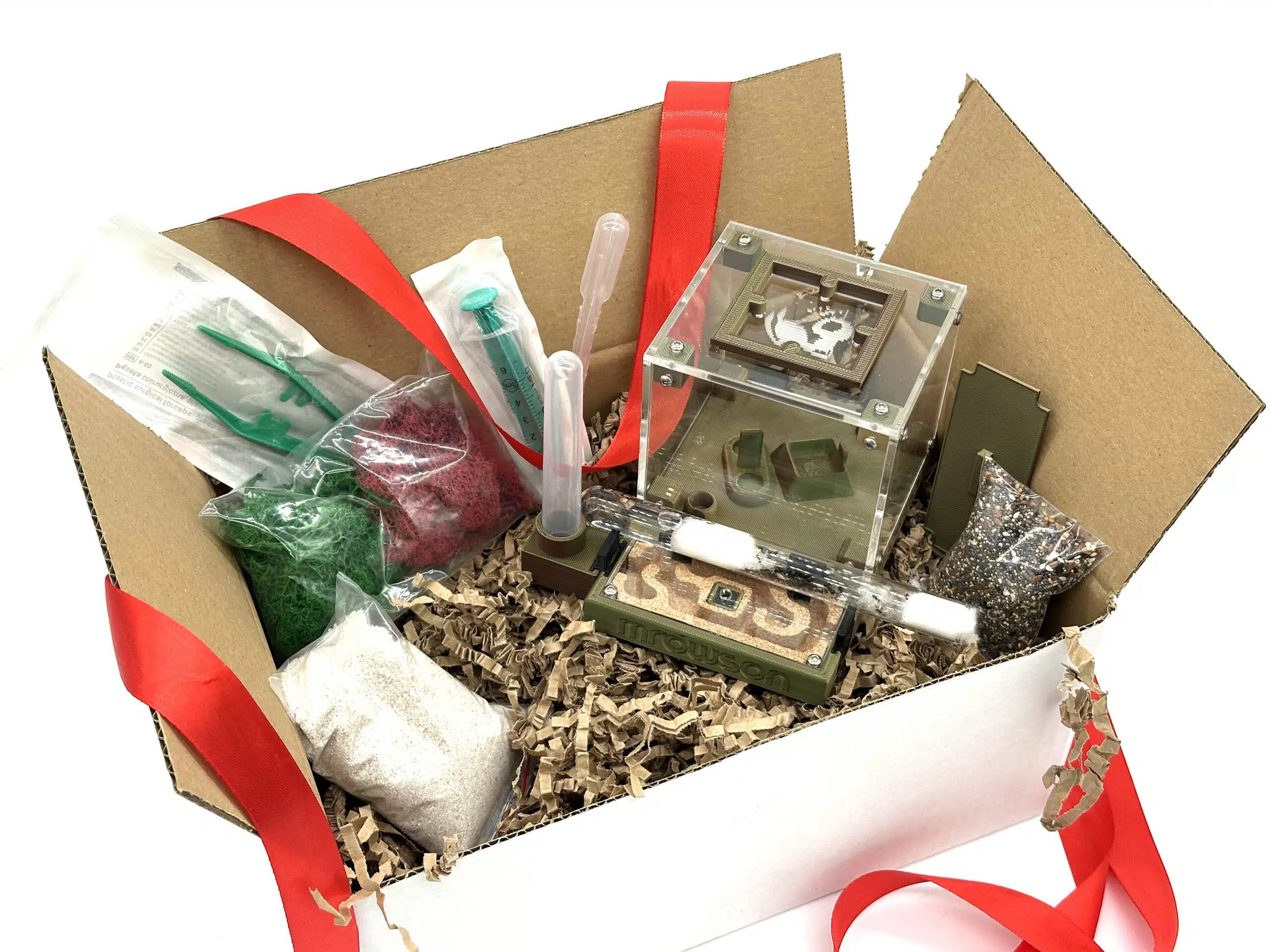 Zestaw prezentowy Julka Forest Moss to gotowy, dopracowany w szczegółach start w hodowlę Messor barbarus – jednej z najciekawszych i najbezpieczniejszych na początek mrówek żniwiarek. Całość zapakowana jest w biały karton przewiązany czerwoną wstążką z kokardką, więc po wyjęciu z paczki masz od razu prezent do wręczenia, bez dodatkowego pakowania. W środku czeka komplet: żywa kolonia, formikarium MK II Julka w kolorze leśnego mchu, mieszanka ziaren i cały niezbędny zestaw akcesoriów.